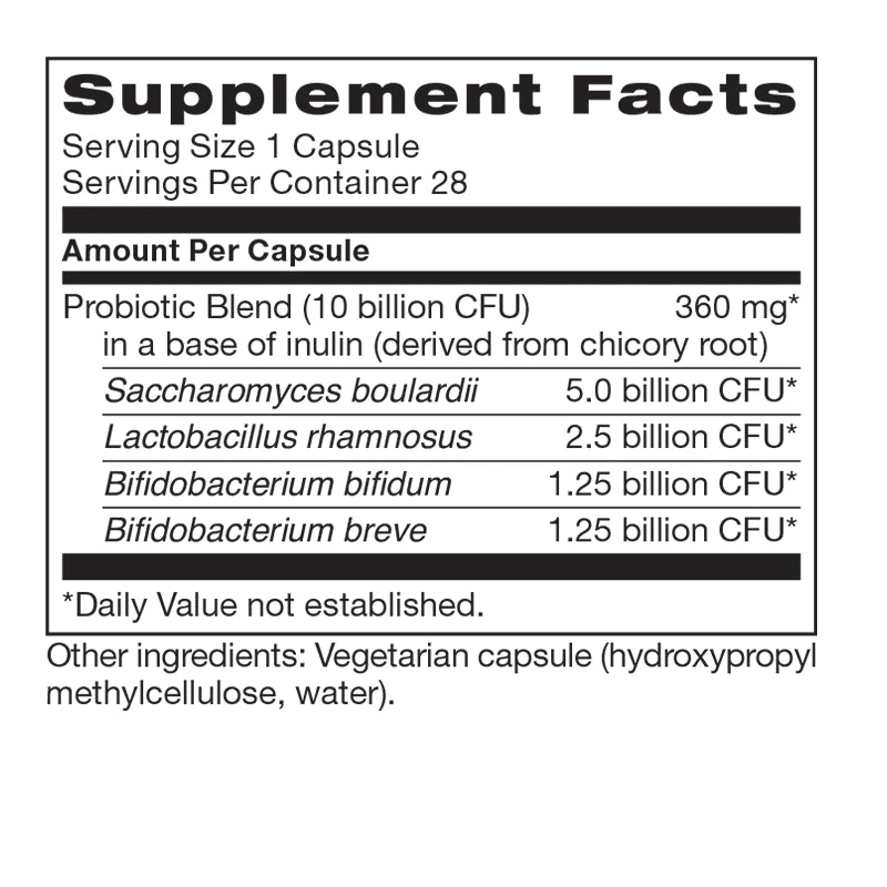 Saccharomyces boulardii — is a non-pathogenic yeast that effectively lessens the occurrence of antibiotic-induced diarrhea, and helps reduce yeast overgrowth that can occur with antibiotic therapy.*